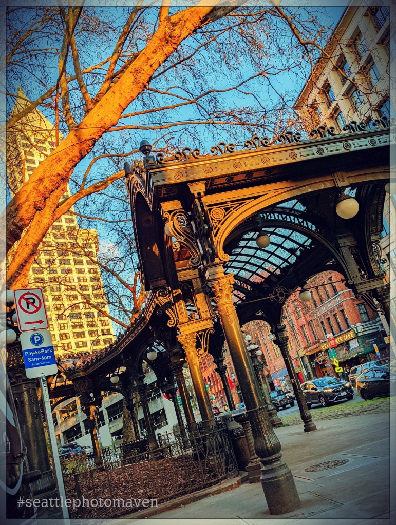 Pioneer Square Pergola cameo, warming in the afternoon sun today.”…built in 1909 to shelter passengers waiting for cable cars on the James Street and Yesler Way lines. The pergola is located at the intersection of 1st Avenue and Yesler Way, and was designated a National Historic Landmark in 1977.” #pioneersquare #seattle