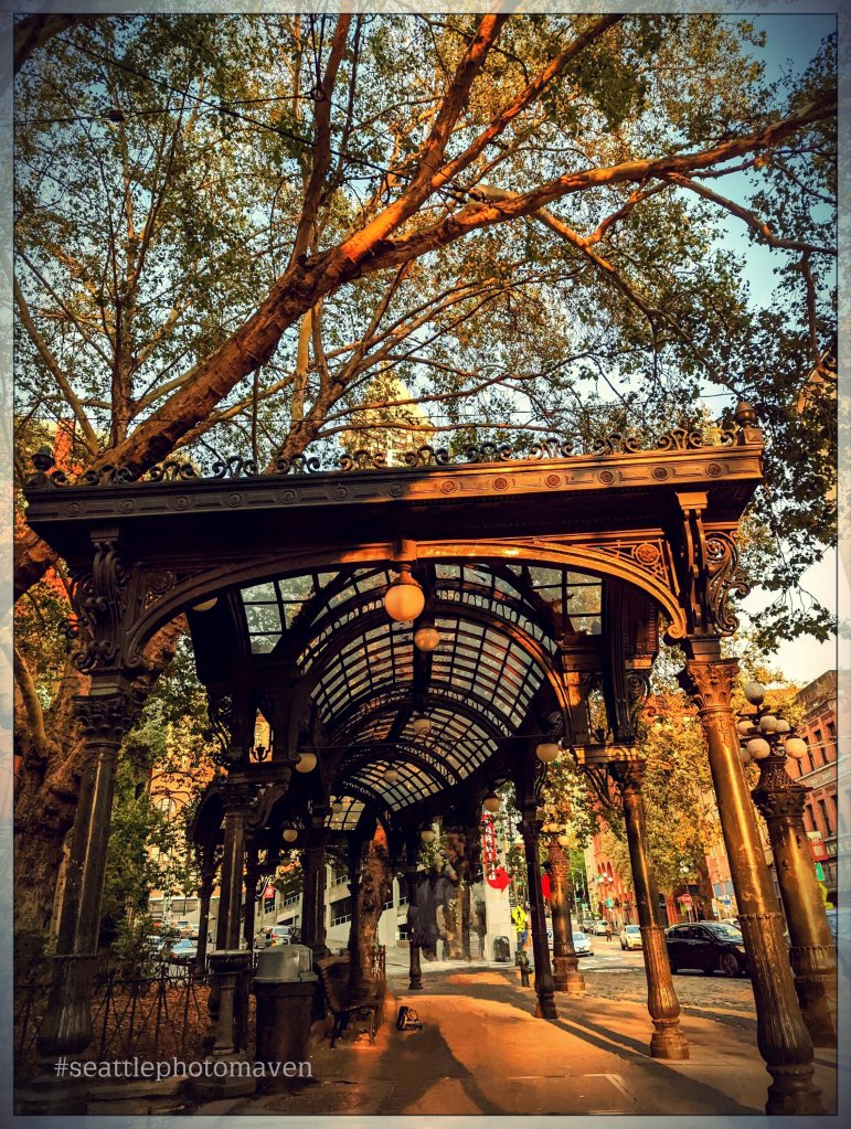 The 113-year-old Pioneer Square pergola is so pretty as the sun begins to fall, tinged with color from the Oregon wildfire.Despite being crashed into and rebuilt…and designated a National Historic Landmark in 1977.So many stories, so much history…